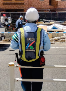 アパホテル大森駅前東作業所で写真のような反射ベストを特注で作成し誘導員が着用しています。